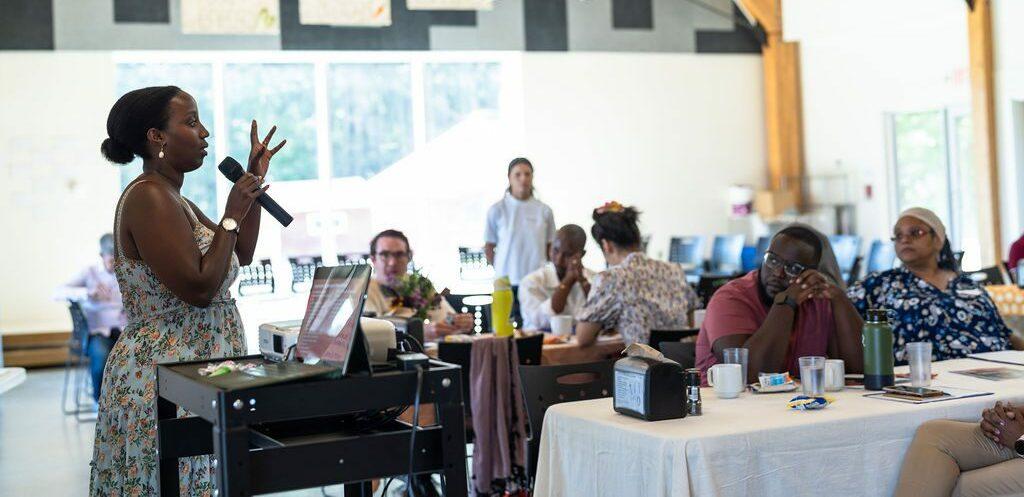 Photo: Shima Kabirigi speaking to participants at the 2025 Immigrant-Led Organizations Fund Retreat. Photo credit: Yoon S. Byun